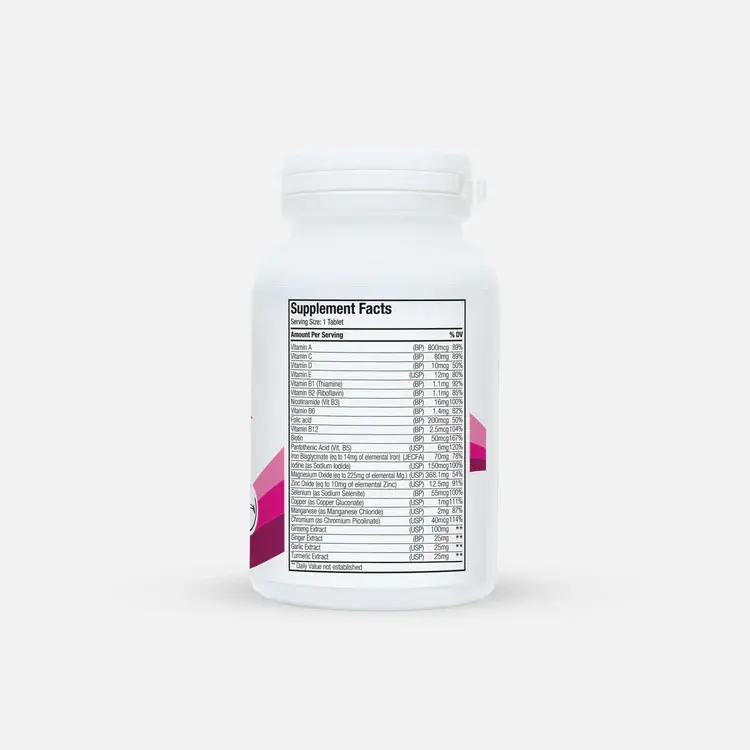 Vitamin A, Vitamin C, Vitamin D3, Vitamin E, Vitamin B1, Vitamin B2, Vitamin B6, Vitamin B12, Niacinamide, Folic Acid, Biotin, Iron, Calcium, Magnesium, Zinc, Selenium, Copper, Manganese, Ginseng, Green Tea Extract, Ginkgo Biloba, Grape Seed Extract, Ashwagandha.