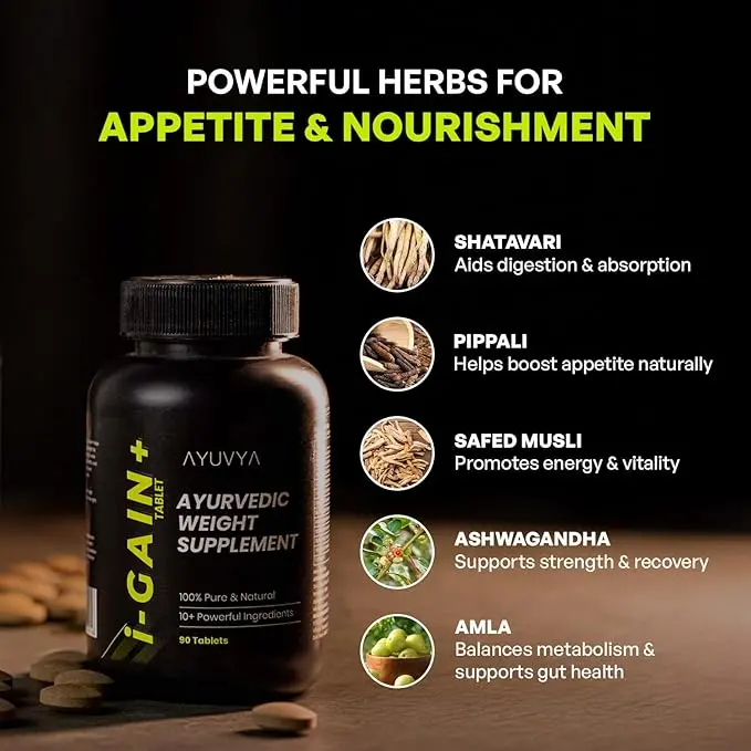 Ayuvya i-Gain+ Weight Gainer is a 100% Ayurvedic supplement designed to help individuals increase muscle mass, strength, and healthy body weight naturally. Its new and improved formula combines potent herbal ingredients to support digestion, nutrient absorption, and overall vitality, making it ideal for those looking to gain weight and build lean muscle without synthetic additives.