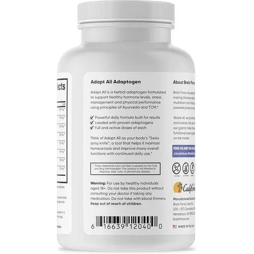 Brain Forza Adapt All contains Ashwagandha, Bacopa, Rhodiola, Ginkgo Biloba, Lemon Balm, Panax Ginseng, Cordyceps, and Schisandra Berry.