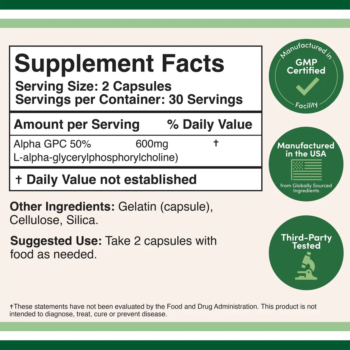 Alpha-GPC (Alpha-Glyceryl Phosphoryl Choline): Main active ingredient for brain health.Rice Flour: Inert filler for capsule stability.Vegetarian Capsule (Hypromellose): For easy digestion.