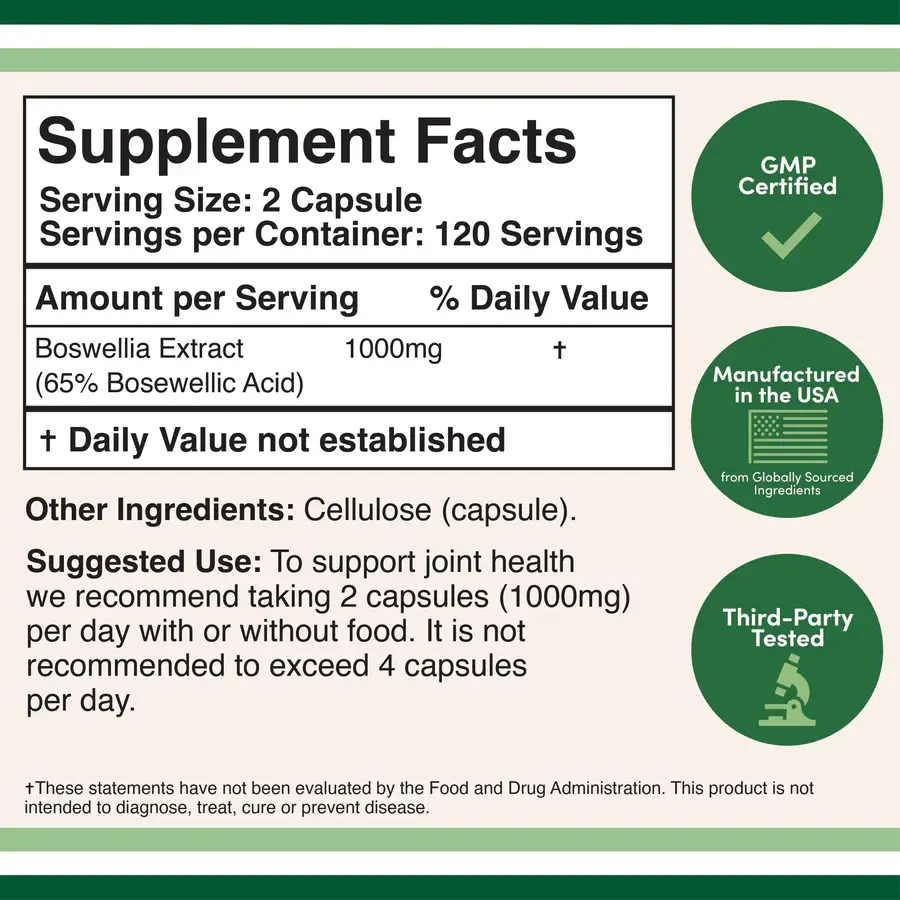 It is usually advised to take 500–1000 mg per day, with or without food. The active ingredient known for its health advantages, boswellic acid, is standardized to 65% in Double Wood Supplements' Boswellia Extract supplement. Boswellia extract is 1,000 mg per serving; two capsules per day, with or without meals, is the suggested dosage. Because it is made in the USA, the product is vegan-friendly, non-GMO, gluten-free, and soy-free.