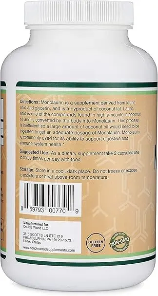 Two Woods A dietary supplement called Monolaurin Supplement is intended to promote the health of the immune system. It contains monolaurin, a substance that is frequently present in breast milk and coconut oil and is formed from lauric acid. Monolaurin, which has antibacterial qualities, may aid in the fight against dangerous infections such as bacteria, fungi, and viruses. For those looking to boost their immune system naturally, this vitamin is perfect A byproduct of coconut fat, monolaurin is a compound that is made from glycerin and lauric acid. Researchers have been looking at potential uses of monolaurin in food preservation, sanitization, and medicine for the last 20 years.
