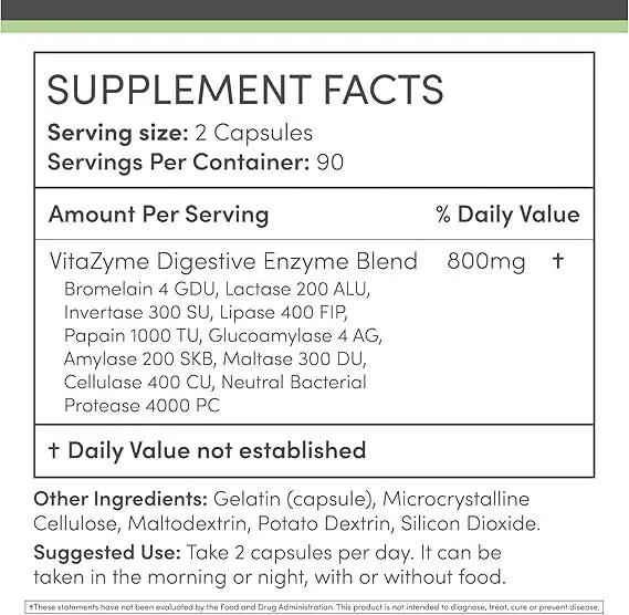 Vital enzyme Digestive Enzyme Blend: 800 mg Bromelain: 4 GD Lactase: 200 ALU Invertase: 300 SU Lipase: 400 FIP Papain: 1,000 TU Glucoamylase: 4 AG Amylase: 200 SKB Maltase: 300 DU Cellulase: 400 CU Neutral Bacterial Protease: 4,000 PC