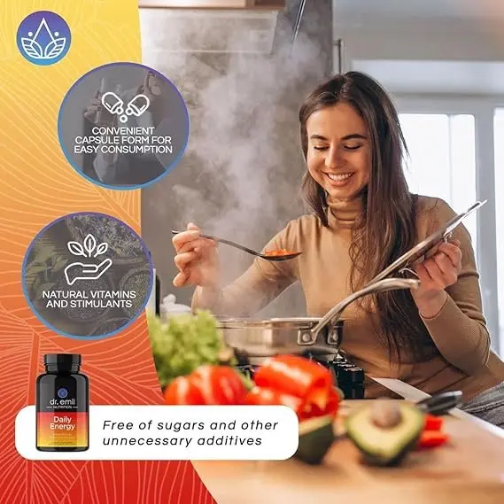 Natural, long-lasting energy and improved mental focus without jitters or crashes are the goals of Dr. Emil Nutrition's Daily Energy Supplement. In addition to vitamins B3, B6, and B12 to improve metabolism and lessen weariness, it contains 160 mg of natural caffeine from sources like guarana, yerba mate, and green tea extract. Furthermore, cayenne pepper may increase metabolism, while L-taurine, L-theanine, and L-tyrosine enhance focus and cognitive performance. The purpose of this supplement is to strengthen brain function, increase productivity, and encourage energy throughout the day. It is free of dairy and sugar, a product that was produced without genetic engineering does not contain genetically modified organisms (GMOs), and is suitable for vegans. Niacin, often known as vitamin B3, promotes healthy nerves and a series of organs that break down food into smaller molecules that can be absorbed into the body function, increase metabolism, and stimulate blood flow.