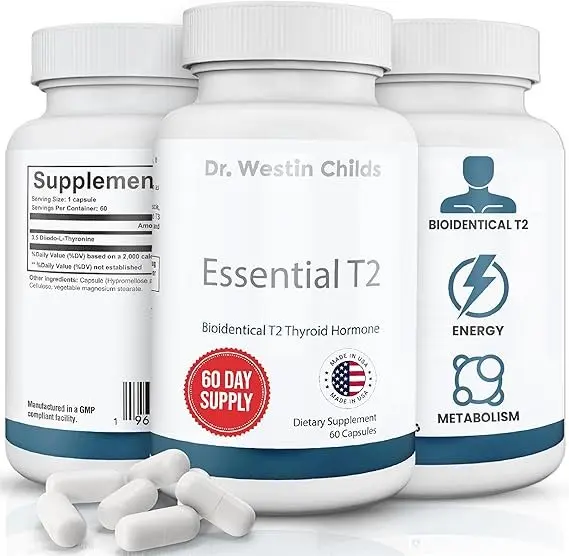 A thyroid support supplement called Dr. Westin Childs' Essential T2 is made using bioidentical 3,5 Diiodo-L-Thyronine (T2) to help those with hypothyroidism, Hashimoto's thyroiditis, thyroidectomy, or radioactive iodine therapy. T2, a hormone that is naturally produced by a healthy thyroid gland, is 100 micrograms per capsule. By simulating the natural hormone synthesis of a healthy thyroid, adding T2 to your routine may improve metabolism, energy levels, and thyroid function in general. To provide a more complete approach to thyroid hormone replacement therapy, this supplement is intended to be used in conjunction with current thyroid drugs.