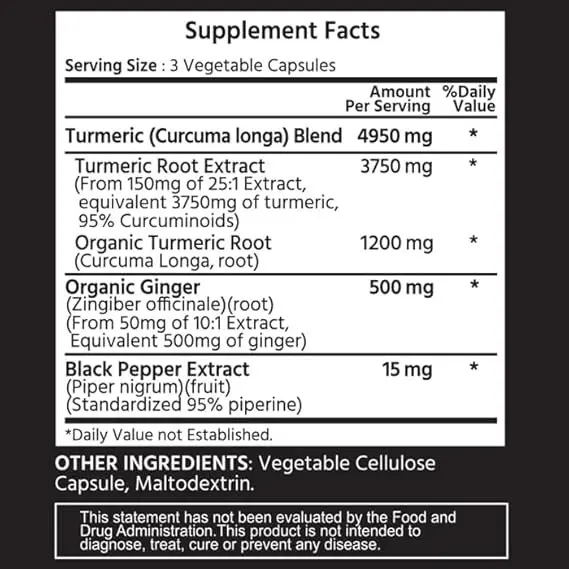 Black pepper extract (piperine) for absorption, ginger extract for digestion and anti-inflammatory support, turmeric root extract (95% curcuminoids), and organic turmeric powder are all included in ML Naturals Extra Strength Turmeric Curcumin.