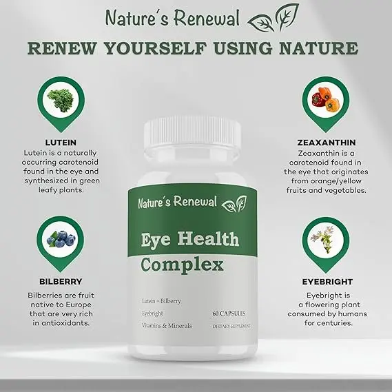 Lutein, zeaxanthin, lycopene, bilberry extract, and eyebright are all components of Nature's Renewal Eye Health Complex, which supports vision, lowers oxidative stress, and promotes eye health.