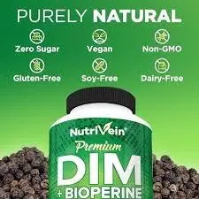 NutriVein DIM + Bioperine Supplement is designed to focus on a balanced diet, regular exercise, stress management, and adequate sleep and normal fitness. Each tablet carries four hundred mg of Diindolylmethane (DIM), a compound derived from cruciferous vegetables, and five mg of BioPerine, a black pepper extract that complements nutrient absorption. DIM enables stability in estrogen levels, making it useful for girls experiencing menopause or PCOS and for guys in search of prostate health aid. The BioPerine boosts DIM's effectiveness, making sure there is higher absorption. The supplement is vegan, non-GMO, gluten-free, and free from fillers or preservatives. DIM is a compound derived from cruciferous greens like broccoli and kale, acknowledged for selling healthful estrogen conversion and detoxification. BioPerine, a black pepper extract, complements the absorption and bioavailability of DIM, ensuring top-rated effectiveness.