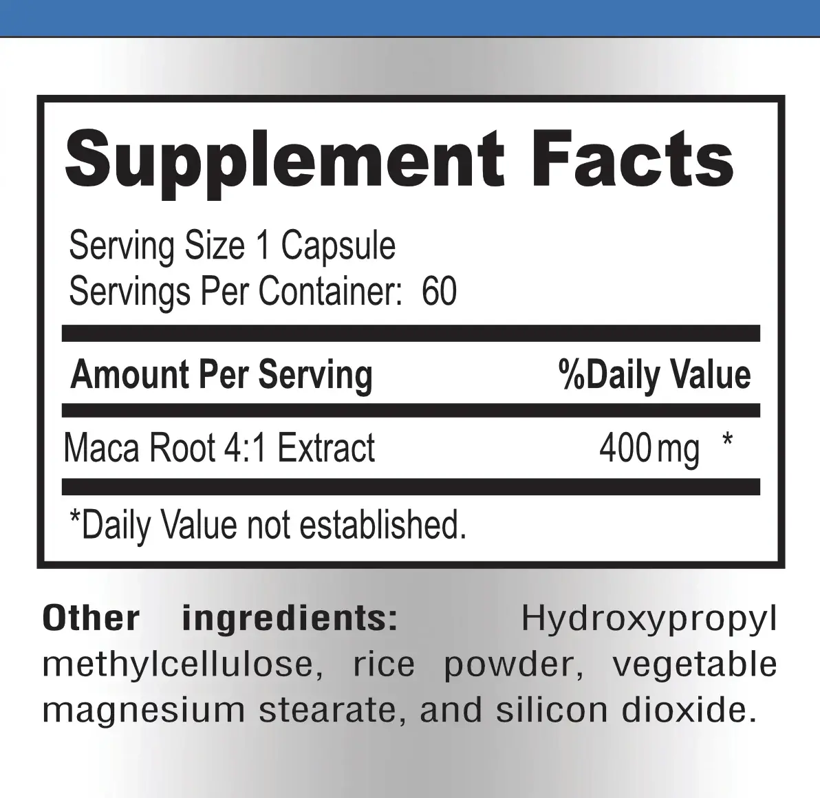 Pure Maxlabs Maca Supplement contains 400mg of 4:1 Maca Root Extract (Lepidium meyenii), equal to 1600mg raw Maca powder.