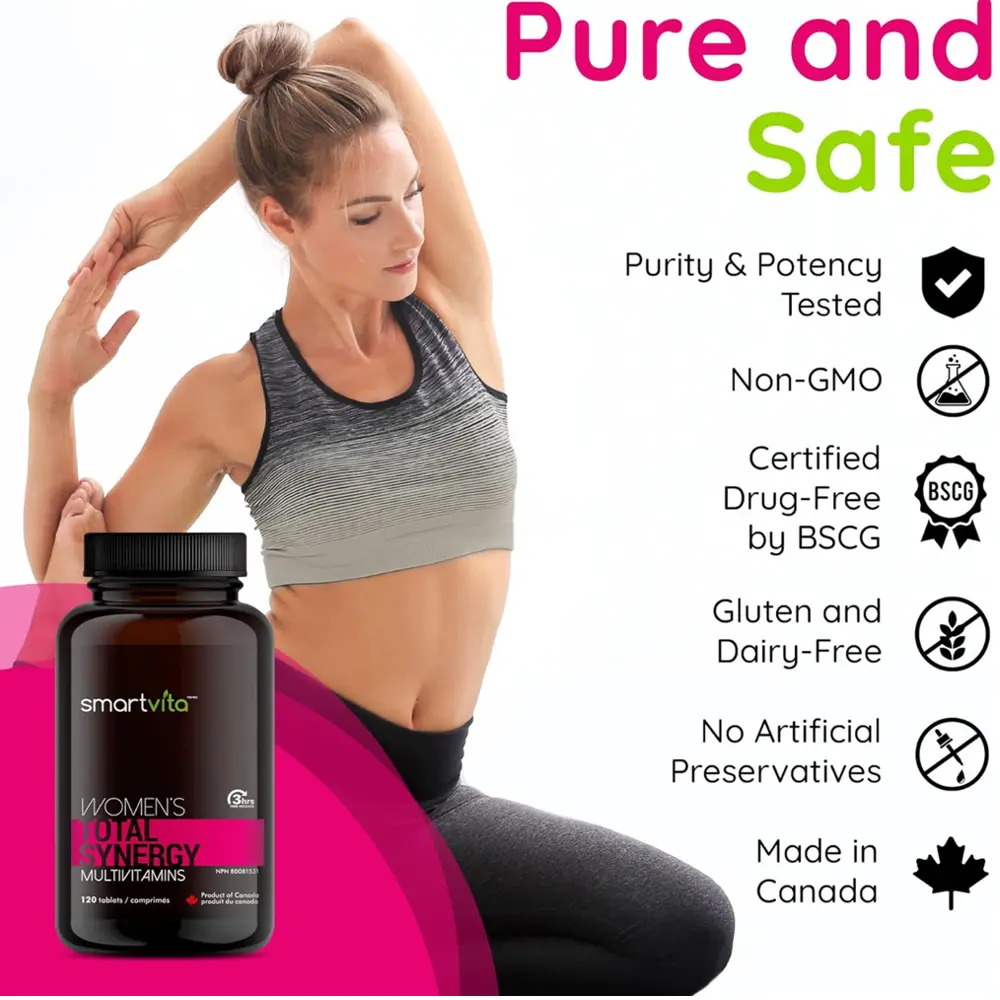 Smartvita Women’s Total Synergy Multivitamins is a premium supplement formulated to meet the unique nutritional needs of women. With essential nutrients such as vitamins B-complex, C, D3, calcium, iron, and antioxidants, it supports energy production, immunity, bone health, hormonal balance, and overall wellness. Designed for women of all ages, this multivitamin ensures daily nutritional gaps are covered, promoting vitality, mental clarity, and long-term health.