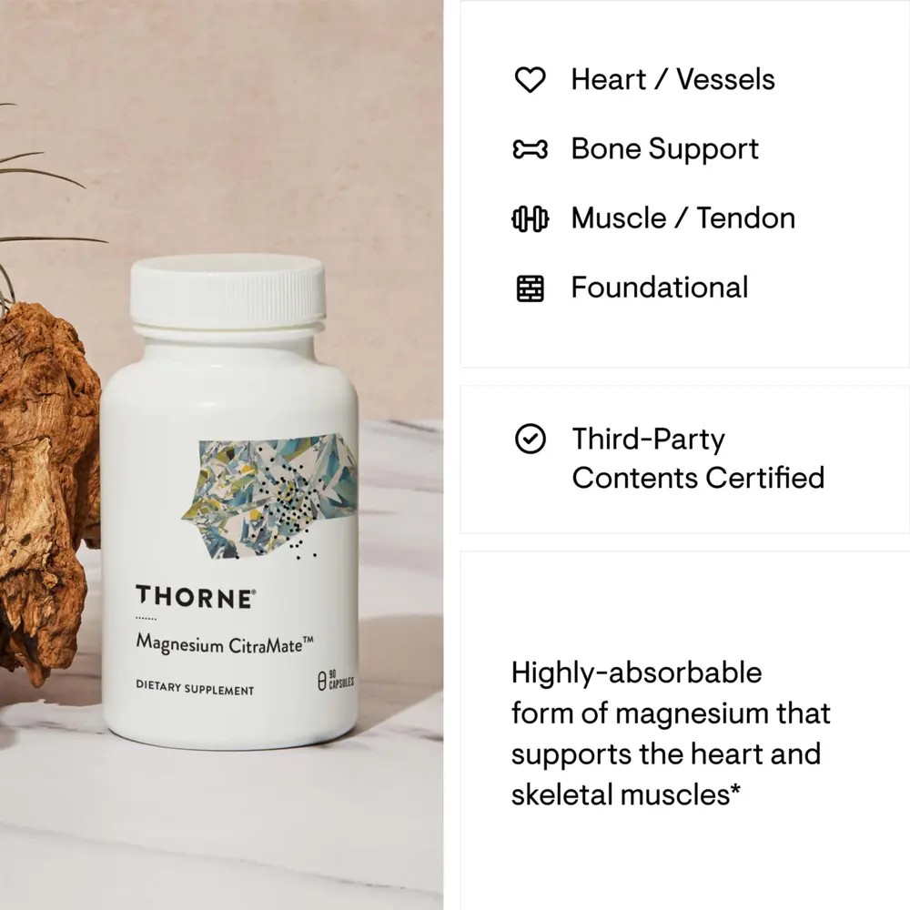 Thorne Magnesium CitraMate is a top-rate nutritional complement that grants relatively absorbable kinds of magnesium—citrate and malate—to aid strength production, muscle function, cardiovascular health, and kidney function. Each tablet provides one hundred thirty-five mg of elemental magnesium from dimagnesium malate and magnesium citrate, each regarded for advanced absorption and gastrointestinal tolerance. This clean, hypoallergenic formulation is right for people searching for magnesium aid without pointless additives. Regular use may also assist in lessening fatigue, relieving muscle cramps, selling calmness, and preserving wholesome bones, blood pressure, and insulin sensitivity.
