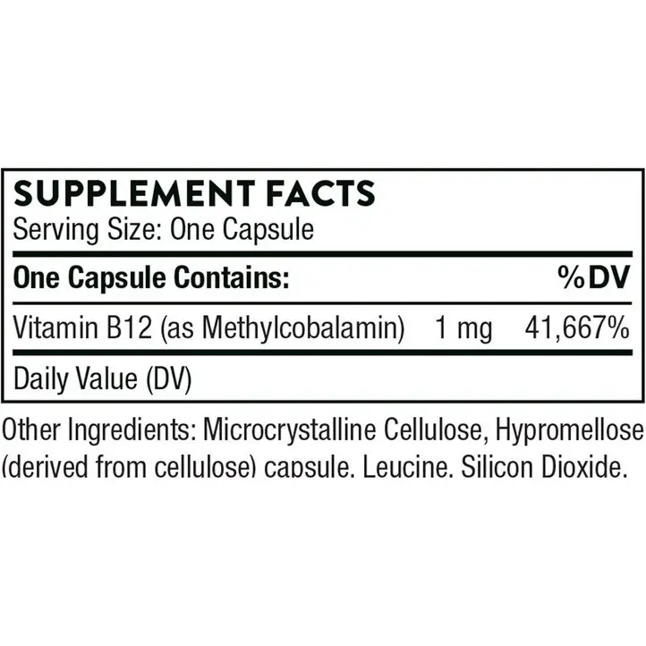 Thorne’s Vitamin B12 gives you a thousand micrograms (that’s 1 mg, for the math-challenged) of methylcobalamin B12 in every little capsule. What else is in the mix? Some microcrystalline cellulose (fancy word for plant fiber filler), hypromellose for the capsule (cellulose again—vegans, rejoice), a dash of leucine, and a sprinkle of silicon dioxide. Basically, it’s B12 and a bunch of stuff to hold it together, nothing wild.