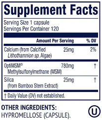 Vimergy MSM contains OptiMSM® (780 mg), silica from bamboo (25 mg), and calcium from algae (25 mg) in a vegetable capsule with organic rice flour.