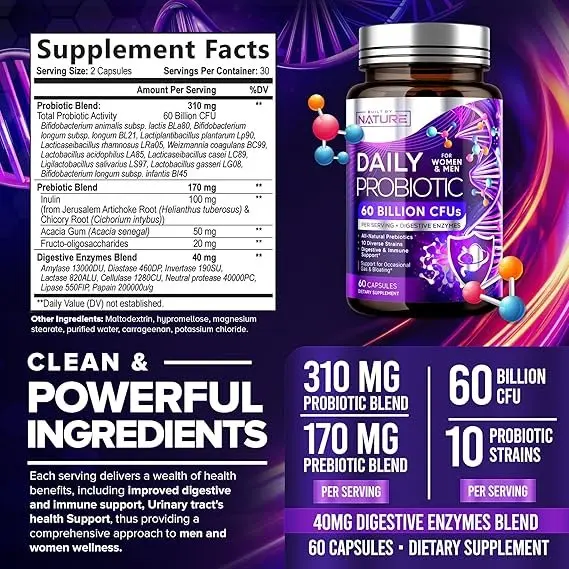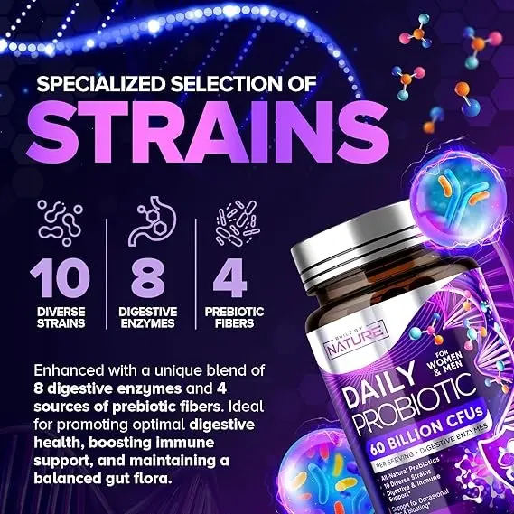 Probiotics and proteins that break down food into smaller molecules so the body can absorb nutrients complement each other to promote the best possible digestive health. Proteins, lipids, and carbs are broken down by proteins that break down food into smaller molecules so the body can absorb nutrients, increasing the accessibility of nutrients for absorption. Live microorganisms that are said to have health benefits, especially for the gut. are good bacteria that live in the gut and help keep the microbiome balanced, which enhances gut health and facilitates effective digestion. By ensuring that food is effectively broken down and fermented less in the gut, they work together to help minimize discomfort in your upper abdomen gas and bloating. Additionally, probiotics help the gut lining, which enhances the absorption of nutrients. Additionally, this combination helps reduce the symptoms of constipation, diarrhea, and IBS. Digestive enzymes with probiotics also boost immunity and improve general health by supporting a healthy gut environment.
