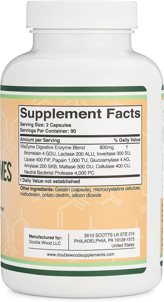 Vital enzyme Digestive Enzyme Blend: 800 mg Bromelain: 4 GD Lactase: 200 ALU Invertase: 300 SU Lipase: 400 FIP Papain: 1,000 TU Glucoamylase: 4 AG Amylase: 200 SKB Maltase: 300 DU Cellulase: 400 CU Neutral Bacterial Protease: 4,000 PC