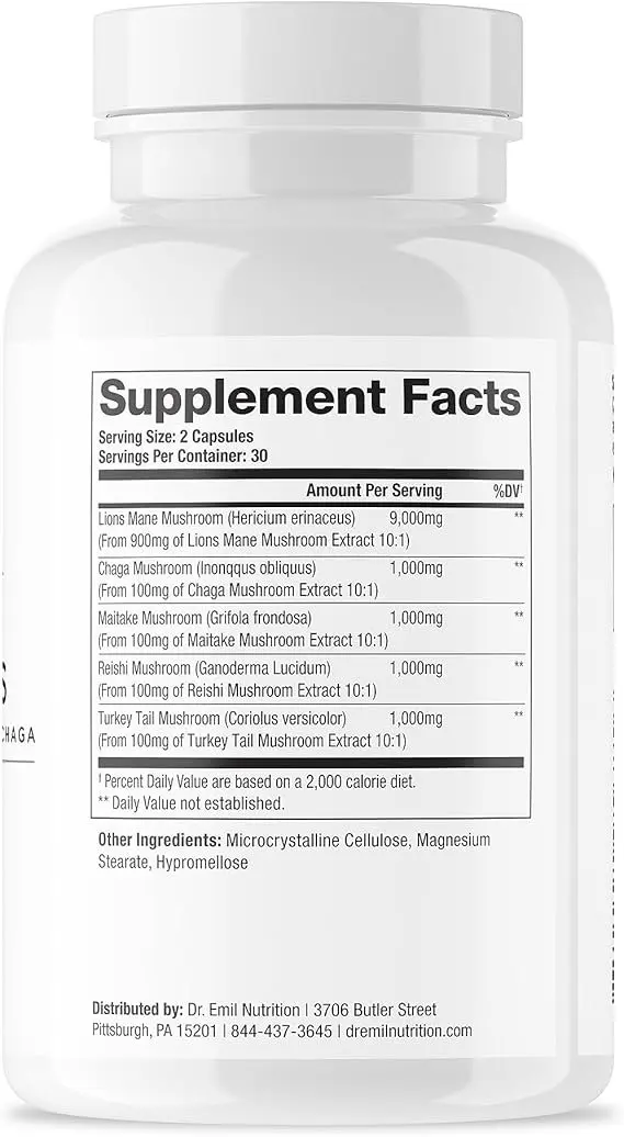 Lion's Mane Mushroom is well known for its ability to improve focus, memory, and brain health. Gain better cognitive abilities and increased clarity. The immune system is strengthened and supported by the combination of chaga, reishi, maitake, and turkey tail mushrooms, which keeps you resistant to common illnesses. Known as the King of Mushrooms, reishi mushrooms have long been used to balance the body's energy and fight stress. With 900 mg of Lion's Mane Mushroom extract at a 10:1 ratio (or 9,000 mg of raw mushroom powder), Dr. Emil Nutrition's Lion's Mane Mushroom Plus is a potent supplement that supports the immune system and cognitive function. For extra support for the brain, immune system, and stress, it also contains Chaga, maitake, reishi, and turkey tail mushrooms. Reishi aids in immunological balance and stress reduction, while Lion's Mane is believed to improve memory, focus, and mental clarity. Maitake and turkey tail assist digestive and general health, while chaga offers antioxidant support. For best results, take two capsules of this vegan, gluten-free, and non-GMO vitamin with water each day.
