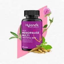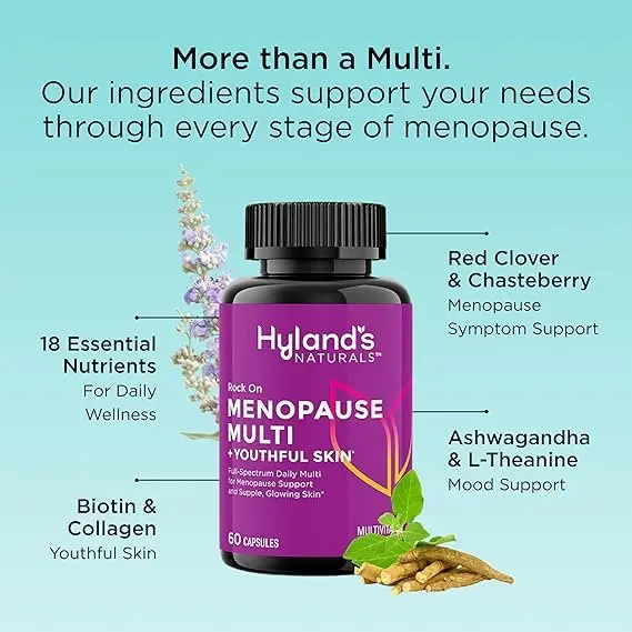 A daily supplement called Hyland's Naturals Menopause Multi + Youthful Skin was carefully created to help women deal with the difficulties of when periods stop for good . . To support bone strength, cognitive function, and immune health, it incorporates 18 vital vitamins and minerals, such as vitamins A, D, E, and K, a complete range of B vitamins; and minerals like magnesium, zinc, and selenium. The supplement contains natural herbal extracts, including red clover, chasteberry, sage leaf powder, ashwagandha, and L-theanine for stress relief to help control common menopausal symptoms like hot flashes, mood swings, and hormone imbalances. With the addition of hydrolyzed collagen and biotin, which enhance skin elasticity and luminosity, it also promotes youthful, healthy skin.