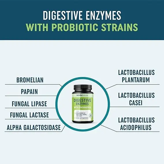 Probiotics and proteins that break down food into smaller molecules so the body can absorb nutrients complement each other to promote the best possible digestive health. Proteins, lipids, and carbs are broken down by enzymes that break down food into smaller molecules so the body can absorb nutrients, increasing the accessibility of nutrients for absorption. Additionally, probiotics help the gut lining, which enhances the absorption of nutrients. Digestive enzymes with probiotics also boost immunity and improve general health by supporting a healthy gut environment.