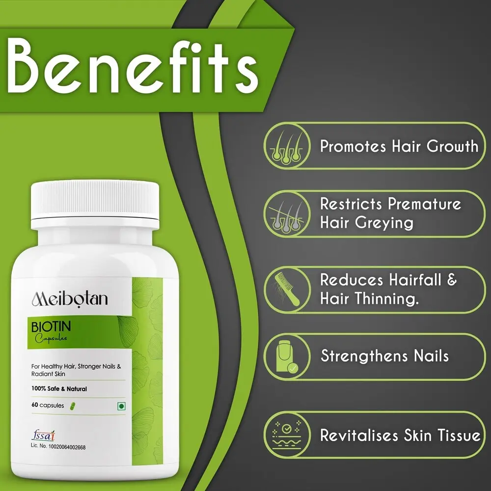Meibotan Biotin Capsules are everyday dietary supplements formulated to guide healthy hair, pores, skin, nails, and metabolism. Each pill usually includes five,000 mcg of Biotin (Vitamin B7), at the side of Calcium and Phosphorus, which make contributions to sturdy bones and strength production. Biotin allows enhanced hair thickness, nail strength, and pore and skin texture at the same time as additionally helping with the breakdown of fats, carbohydrates, and proteins. The pills are normally taken as soon as every day with meals. Meibotan Biotin Capsules provide an effective mixture of biotin and bone-helping minerals to sell more potent hair, clearer pores and skin, higher nails, and basic vitality.