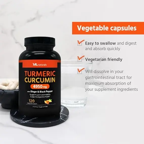 Black pepper extract (piperine) for absorption, ginger extract for digestion and anti-inflammatory support, turmeric root extract (95% curcuminoids), and organic turmeric powder are all included in ML Naturals Extra Strength Turmeric Curcumin.