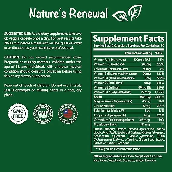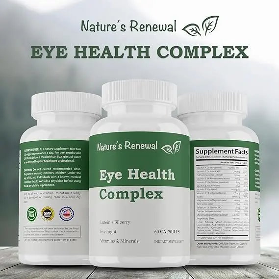 A dietary complement known as Nature`s Renewal Eye Health Complex combines 24 superb ingredients, along with vitamins, minerals, herbs, carotenoids, extracts, and antioxidants, to help and defend vision. Important additives encompass zeaxanthin, which capabilities in tandem with lutein to defend the eyes from oxidative stress, and lutein, which serves as a barrier towards negative high-strength mild and possesses powerful antioxidant qualities. While lycopene, another potent antioxidant, helps in a chemical reaction where an acid and base quantitatively mix to generate a salt and water as products of free radicals, bilberry extract encourages healthy blood flow inside the eyes and reduces fatigue. With its antioxidant-rich mix, the supplement keeps macular health, helps fashionable vision, and lowers oxidative stress. Consistent eye care is ensured by the easily swallowed pills that fit into a regular schedule. produced The product is subjected to stringent third-party testing for quality and purity in a USA GMP-certified facility.