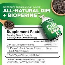 NutriVein DIM + Bioperine Supplement gives several benefits for hormonal stability and overall well-being. Each tablet contains 400 mg of Diindolylmethane (DIM), which helps metabolize estrogen, maintaining a healthy balance between estrogen and testosterone levels. This may be especially useful for ladies experiencing signs of menopause or polycystic ovary syndrome (PCOS), including hormonal zits and warm flashes