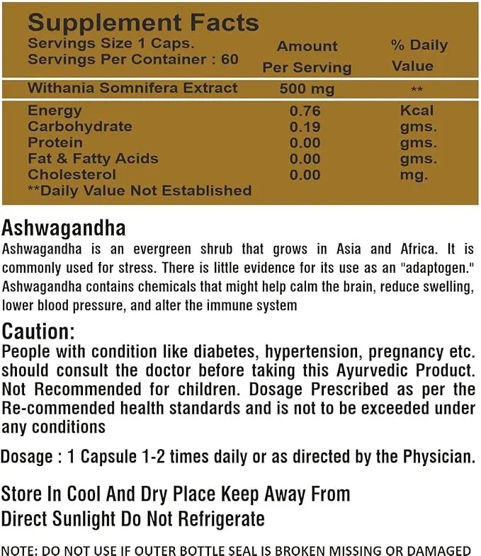 Ashwagandha Root Extract (Withania somnifera), Vegetable Cellulose (capsule), Organic Rice Flour, Magnesium Stearate (vegetable source), Silicon Dioxide.