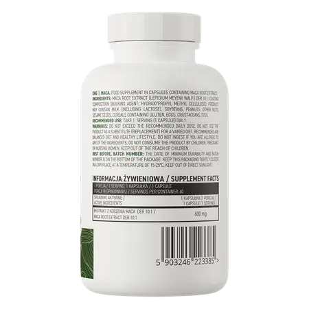 OstroVit Maca 600mg Supplement contains Maca Root Extract (Lepidium meyenii) and a Hydroxypropyl Methylcellulose (HPMC) capsule shell, suitable for vegetarians and vegans.