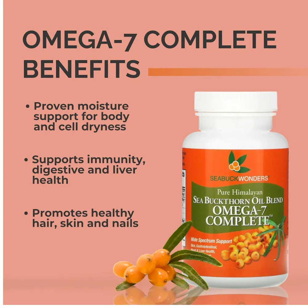 Sea buck Wonders Omega-7 Supplement is a premium plant-based source of a type of polyunsaturated fat, specifically those with a double bond three carbons away from the methyl end of the molecule, derived from Himalayan sea buckthorn berries. Rich in palmitoleic acid (Omega-7), this supplement supports mucous membrane health, skin hydration, cardiovascular wellness, and metabolic balance. It additionally includes two types of polyunsaturated fats that are essential for human health and 9 for a well-rounded fatty acid profile. The product is non-GMO, vegan, and sustainably harvested to ensure purity and potency. Ideal for promoting healthy skin, hair, nails, and internal wellness, Sea buck Wonders delivers essential nutrients in a soft gel for easy daily use. It's a natural choice for anyone seeking to boost vitality and overall health.