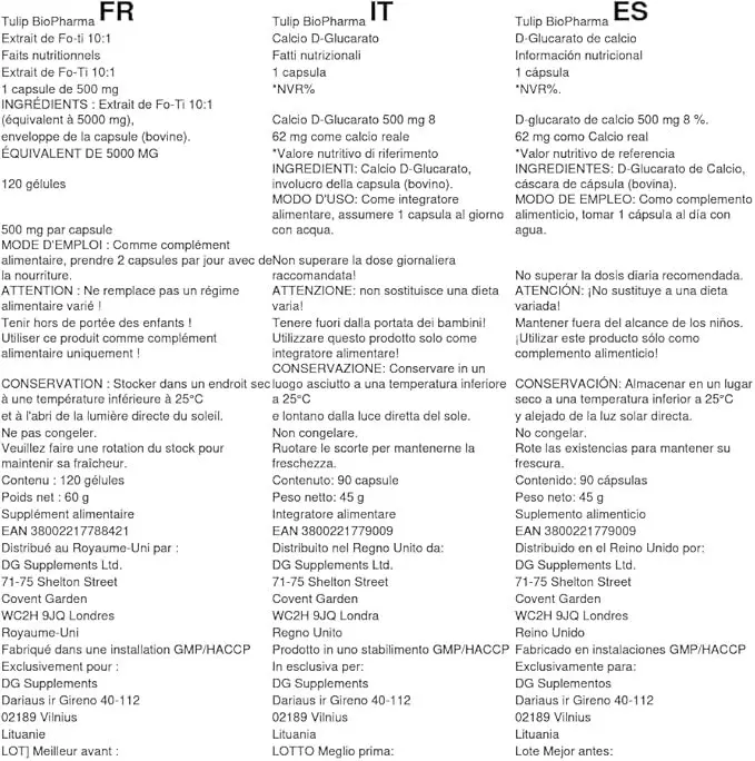 Tulip Biopharma The Calcium D-Glucarate Supplement contains Calcium D-Glucarate, Magnesium Stearate, Rice Flour, and Vegetable Cellulose (Capsule).