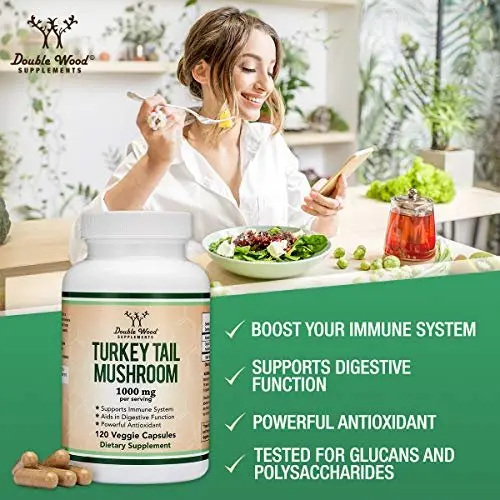 The Turkey Tail mushroom (Trametes versicolor) is the source of the premium Double Wood Turkey Tail Mushroom Supplement. This supplement, which is well-known for strengthening the immune system, is full of polysaccharides, such as beta-glucans, that promote general health. The pure and powerful mushroom extract is used in each pill to support digestive health, vigor, and energy. It is safe and effective for everyday use because it is non-GMO, gluten-free, and produced in the USA by strict quality standards.